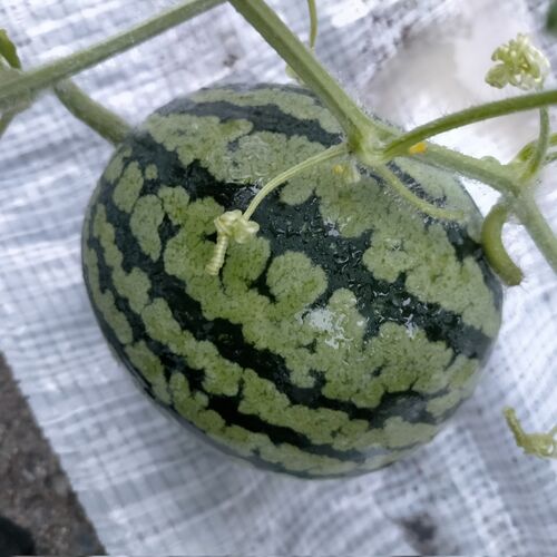 抑制栽培スイカのひとりじめ。着果完了しました。9月下旬の収穫になる。冬瓜台木だけど暑さ&モザイク病で弱ってて葉っぱ小さい。全部2kg以下かな〜。でも10個以上とれそう。 わかりにくいけどモザイク病(CMV)。スイカはメロンなどと比べるとCMVには強くて…