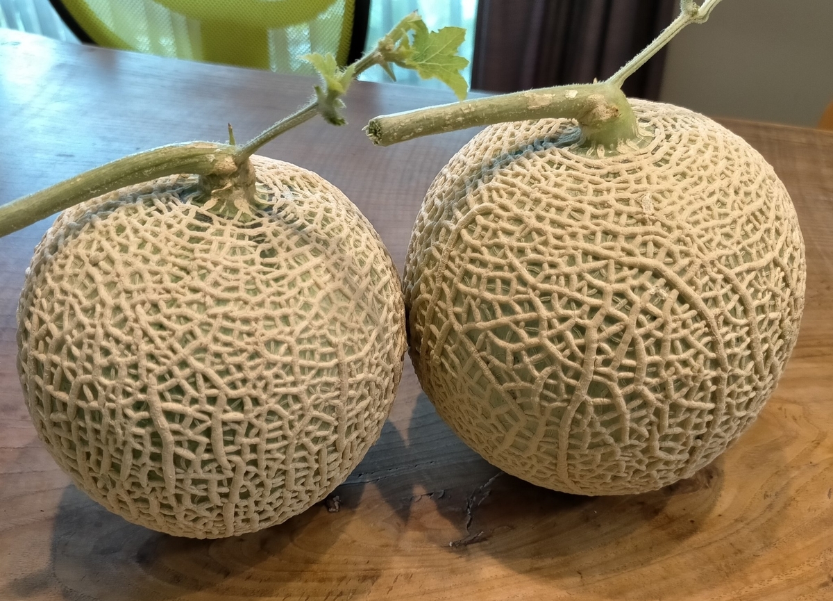 アールスダーリン収穫しました。積算温度1380℃くらい。終盤の草勢は強かった。遊び蔓に着果しまくってて取るのが大変。おかげで梅雨明けの暑さは余裕だったけど、もうちょっと弱くてもよかったかな。果実サイズは小さくて、右の大きいやつでも1.3kg、左は1.0kgしかない。小せえ〜! T字の蔓先が細すぎる。首が短いのはいい。ネットは荒いけど盛りはまあまあ。形はやや凸凹してるけど丸い。これで1.5kg以上あって蔓が太ければ一応成功と言えるんだけどな。交配をもっと遅らせた方がよかった感じ。