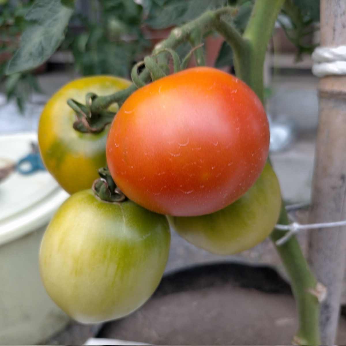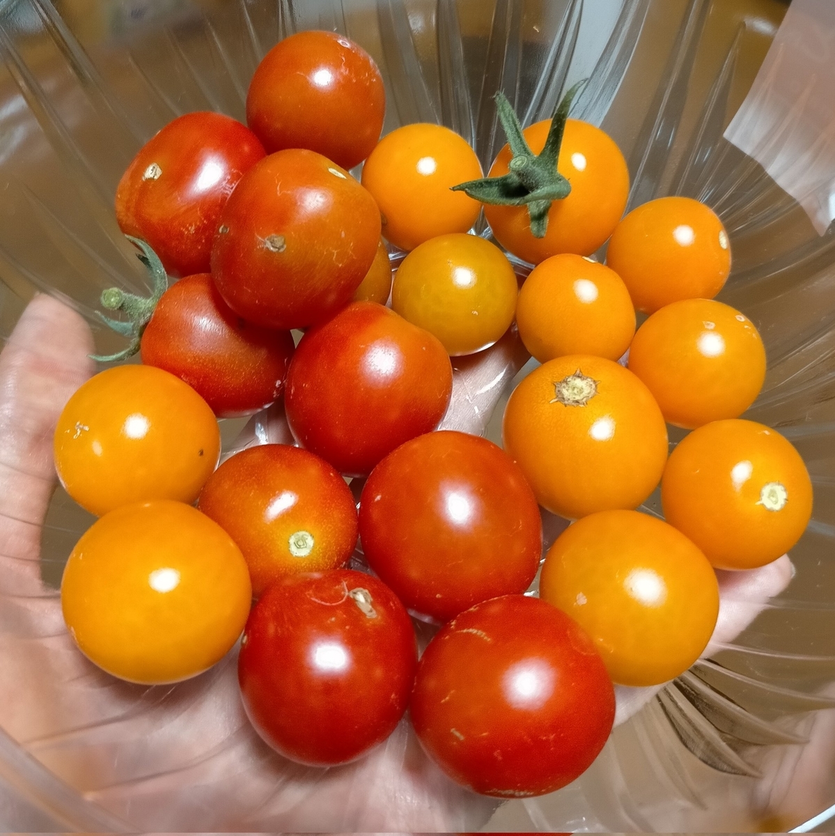 ミニトマトがだんだん収穫できるようになってきました。雹のダメージがまだ残ってる。摘芯しちゃったからすぐ終わるな。