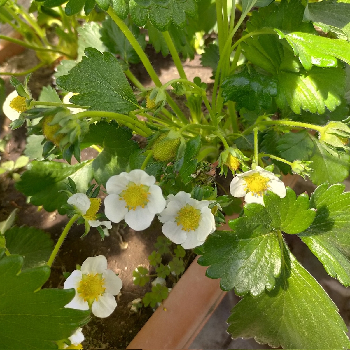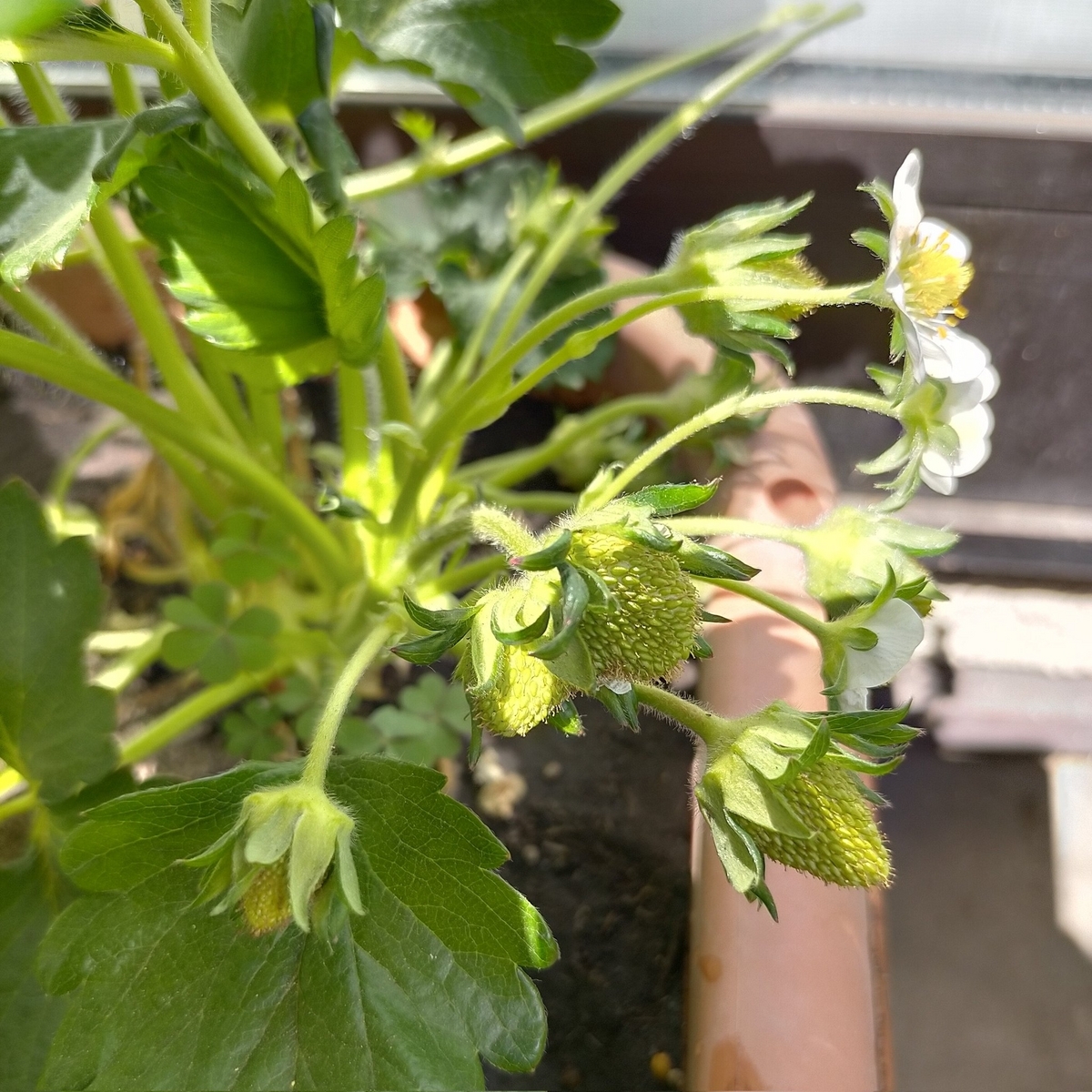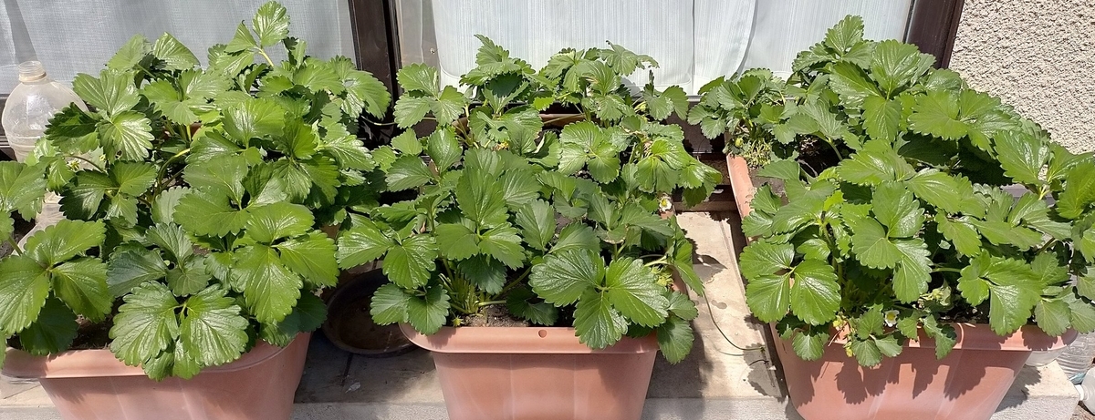 イチゴ全景。草丈は最大で25cm、株間は20cmで狭くないので、普通の品種よりも小柄だと思う。ただし水分不足気味なのがあって若干生育が抑制されてる。このプランター、真ん中だけ黒土で、両端は重粘土で水持ちがいいんですよね。