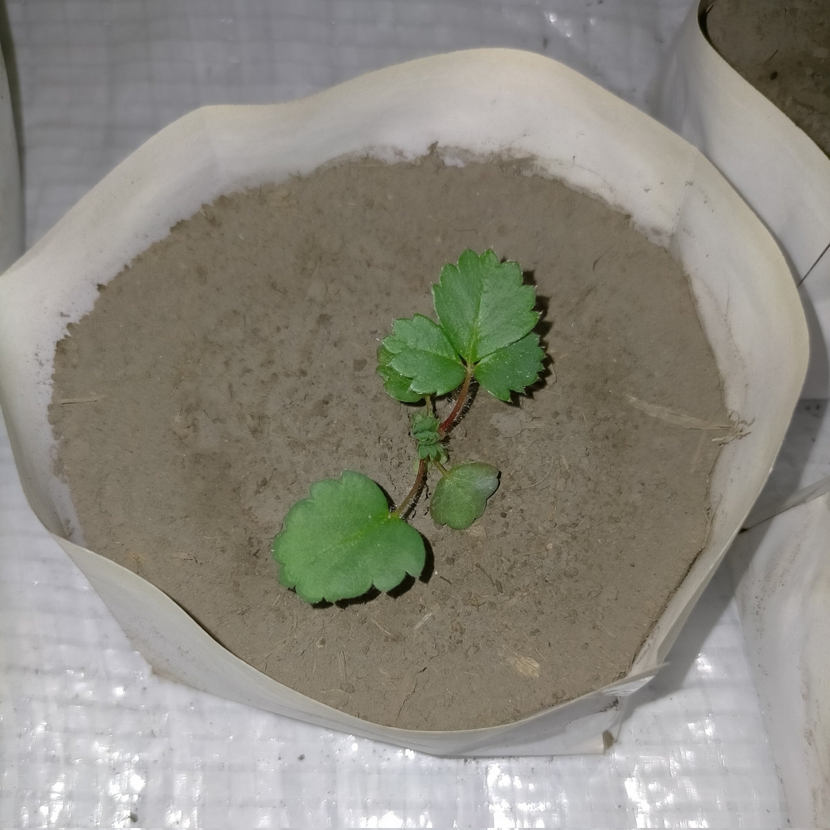 これは普通のコピー用紙(使用済みの要らない紙)で作ったペーパーポットで、土が重粘土で固まりやすいのもあって、これでも実用的な強度になってます。イチゴはペーパーポットで育苗すると気化熱で地温が下がって花芽分化が1週間くらい早まるので嬉しい。