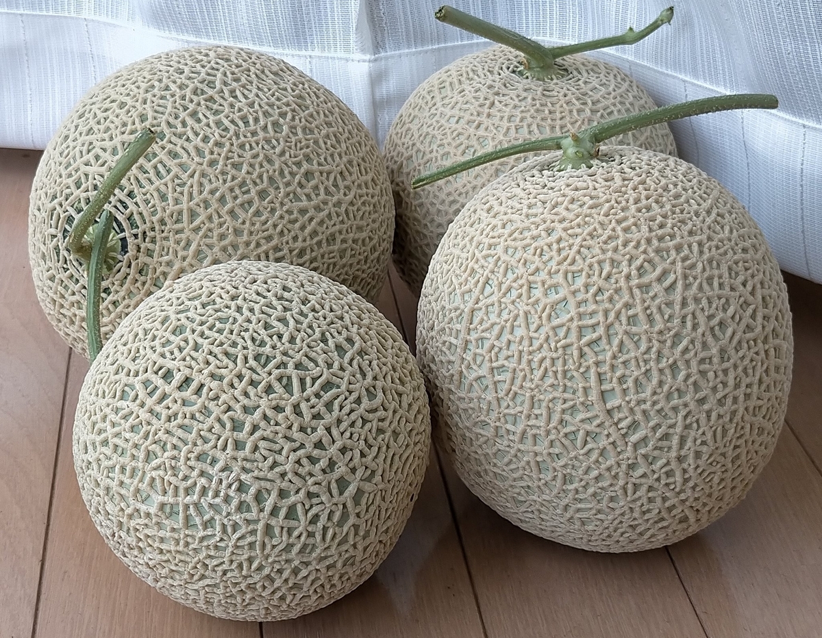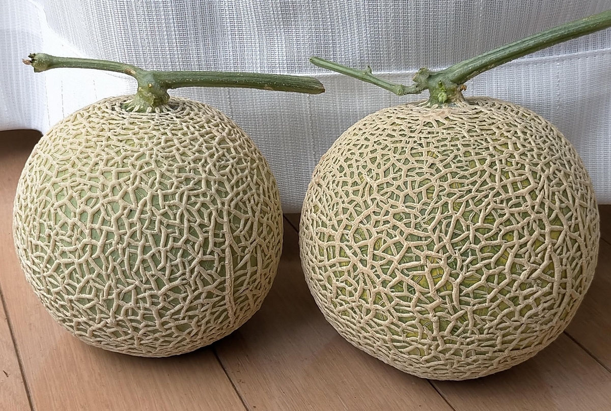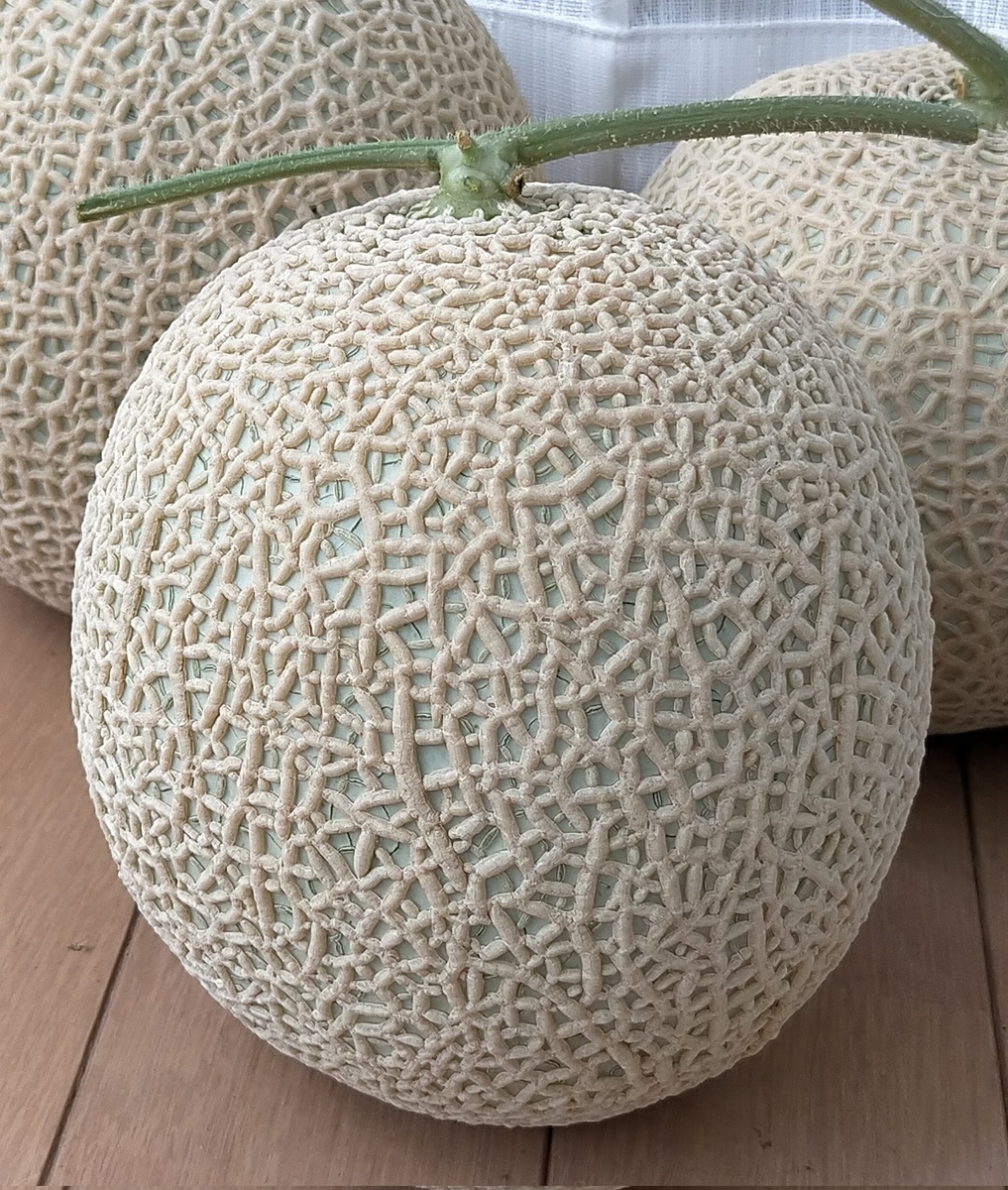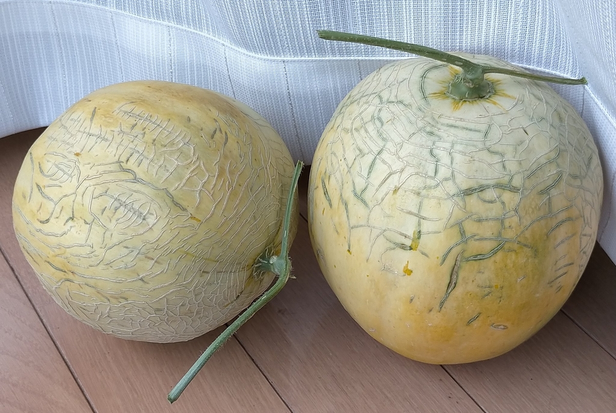 メロン(エテルナ)収穫しました。積算温度1500~1580℃。遅れて着果したジャンボメロン(2.2kg)を除けば平均1.3kgで小さめになった。交配前の草勢をもっと強めなれば。交配後はずっと草勢強くて、もうちょっと弱らせてもよかったけど暑すぎたので放置しました。灼熱でも肥大はせず、ネットはまあまあ綺麗になった。傘かけしたものは肌が白め。アンテナが弱くて、片方無いものがある。もうちょっとで理想のメロンになりそうな気はしてるんですけどね。また来年頑張りましょう。ちなみに事前に試し切りしたものは十分甘くなってました。