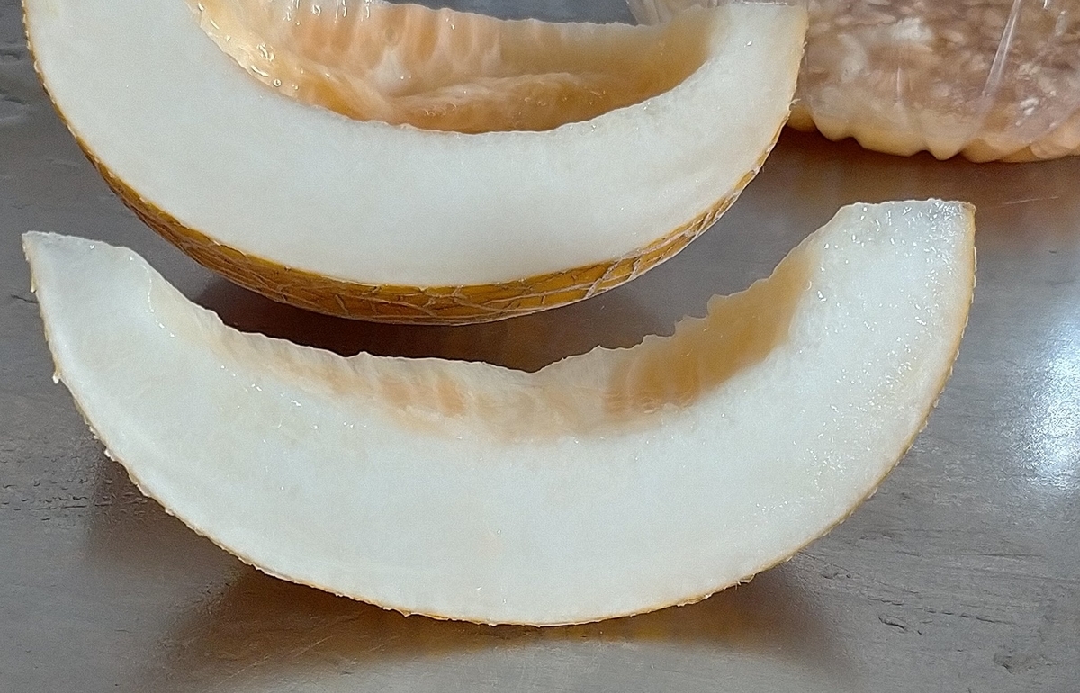 バーネットヒルフェボリット。積算温度1200℃くらいで離層ができる早生。果皮が鮮やかなオレンジ色で、ネットも一応出る。果肉は純白で、香りはヒーローオブロッキンジに似てて強め。甘さはヒーローより遥かに強くて、果肉は柔らかめなのでかなり美味しいメロンでした。ヒーローよりマシだけど日持ち短そうで追熟は3日で十分。肥大性は弱かった。うどんこ病に弱くて真っ先に感染する。台木として使われる品種なので、つる割れ病には強くて汚染土壌でも自根栽培できる。他の古い品種と比べたらなかなかいい品種。