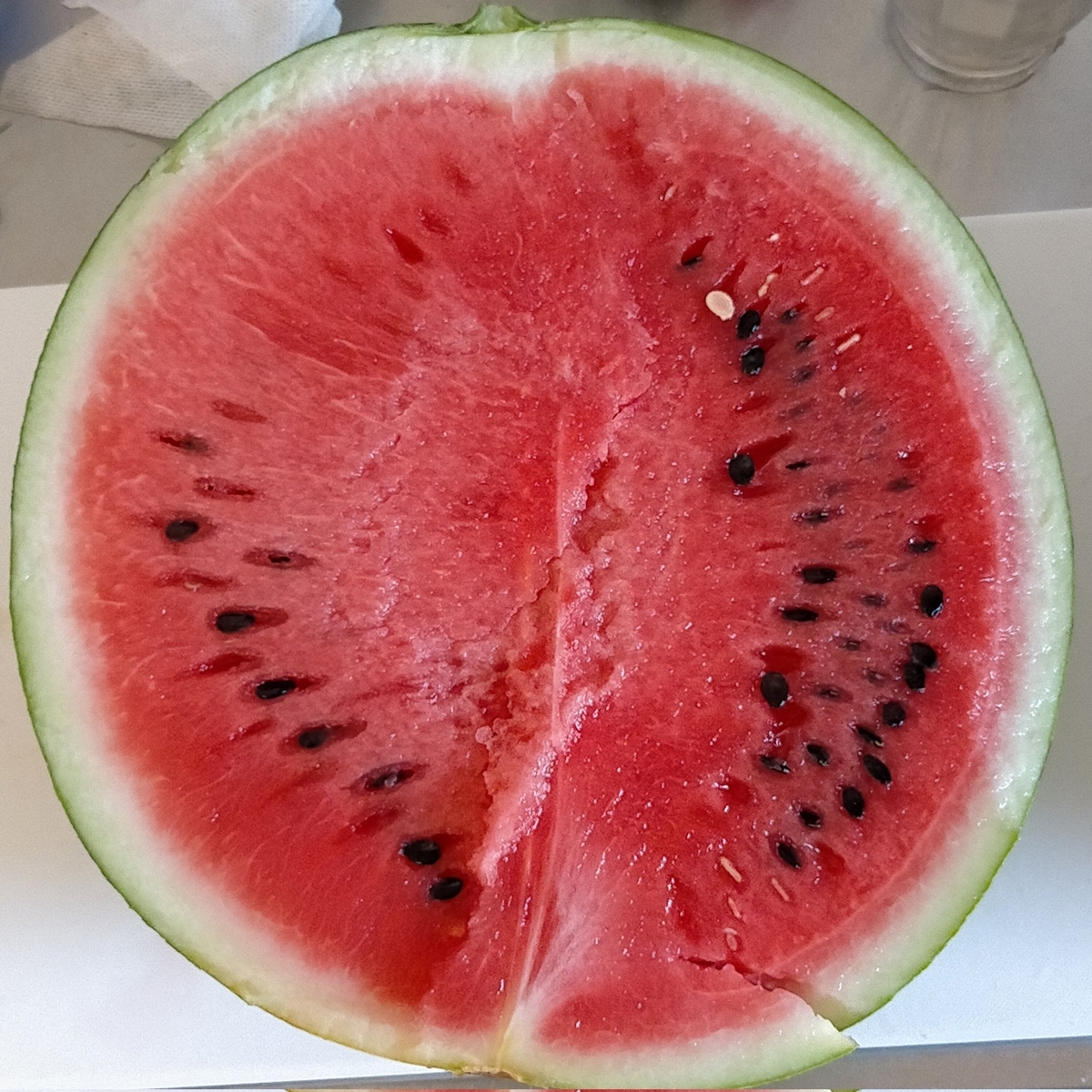 遅植えの味きららtype2。7.5kgで積算温度1050℃。雨が降らず1ヶ月間ずっと水やりしてた。中身ほぼ完璧な出来になりました。皮際までシャリが均質。家人に桃(あかつき)と並べて食べさせたら「スイカの方が甘い」って言ってました。