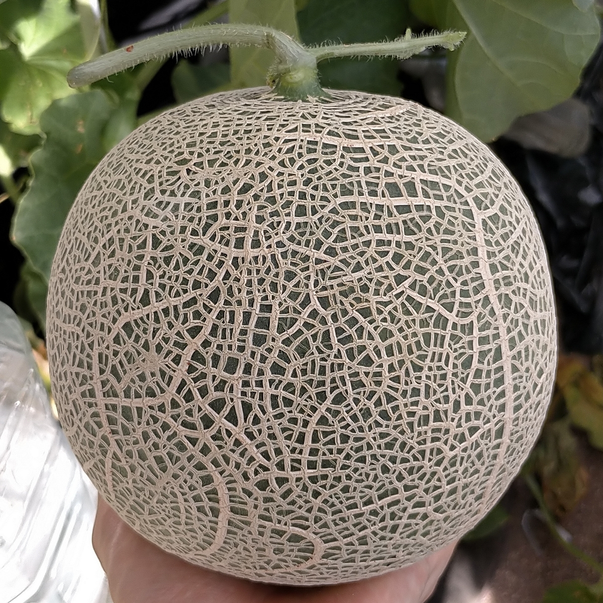 純系アールス収穫しました。積算温度1480℃。重さは1.6kgで大きめサイズ。草勢は完璧で、収穫数日前になって蔓先がじわじわ伸び出してきた感じなので、中身は期待できる。ネットは最初に強めに出たけど、それ以降非常に暑かったので全然盛らなかった(今年の7月の平均気温は28.8℃で過去最高より0.1℃だけ低かった。過去最高は去年と2018年)。果形は真ん丸で綺麗。果皮は遮光なしだけど葉の陰に入ってて黄化はしなかった。草勢弱かったり日に当たると黄化しやすい。アンテナはしょぼい。既にハチミツのような甘い香りがする。