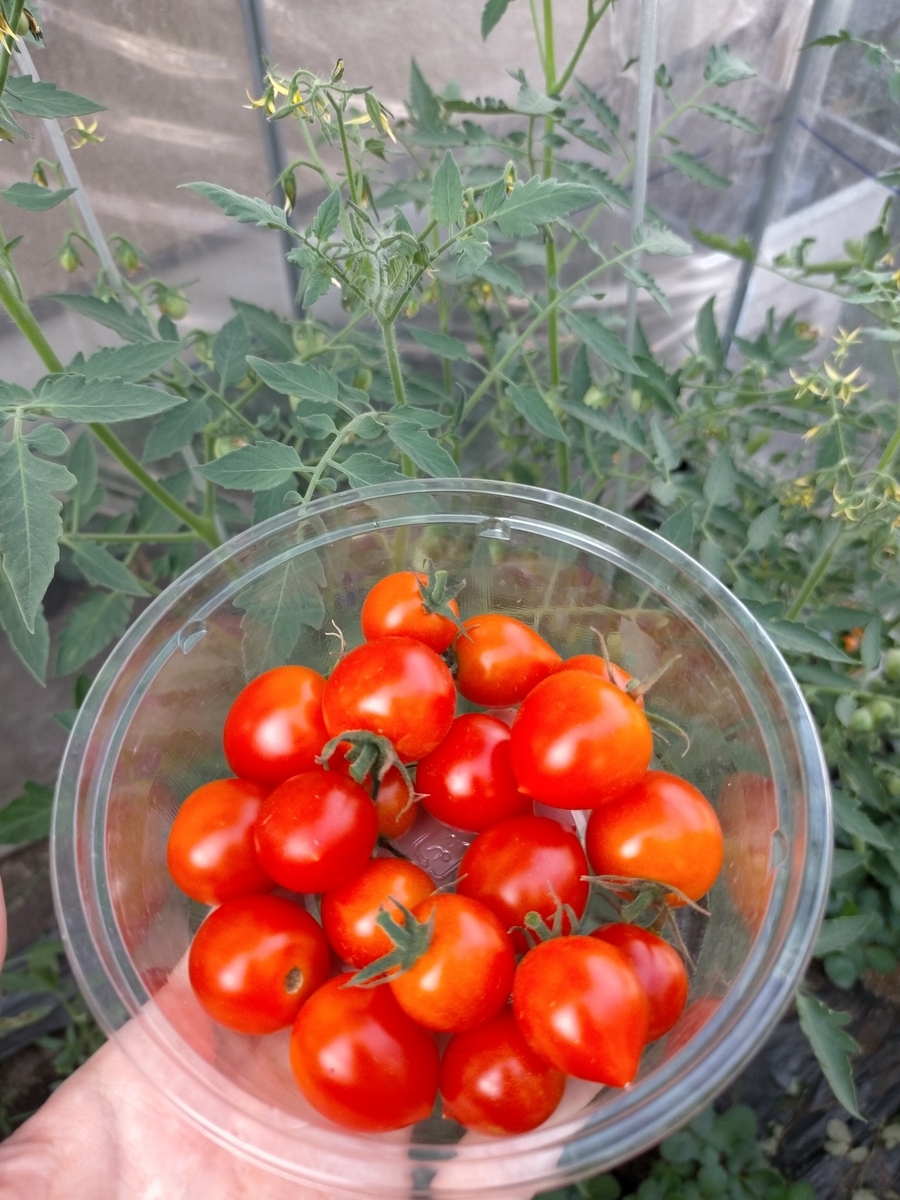 TYべにすずめという品種のミニトマト。黄化葉巻病耐病性と単為結果性を併せ持つ品種です。当地での8月以降の栽培では、黄化葉巻病は毎年発生していて、高温で着果しなくなるのでホルモン処理必須だが、生育が早すぎ&花多すぎて作業がしんどいという問題があり、この品種を今回育ててみました。