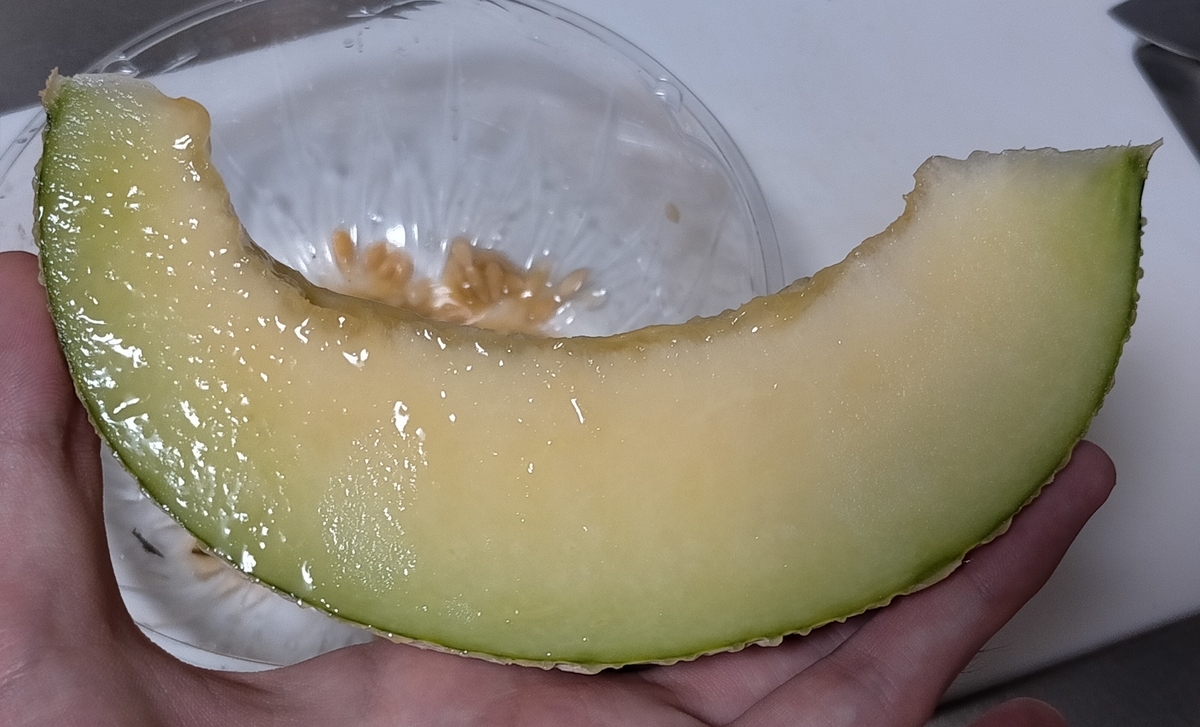 大きすぎてネットはしょぼい。肌は白いけど、大きすぎてもう外観どうでもいいやと途中から傘掛け適当にしといたので一部日焼けして黒くなりました。香りがなかなか強く、果皮が微妙に黄化してて、熟しすぎたのかなと思ったけど別にそうでもなかった。